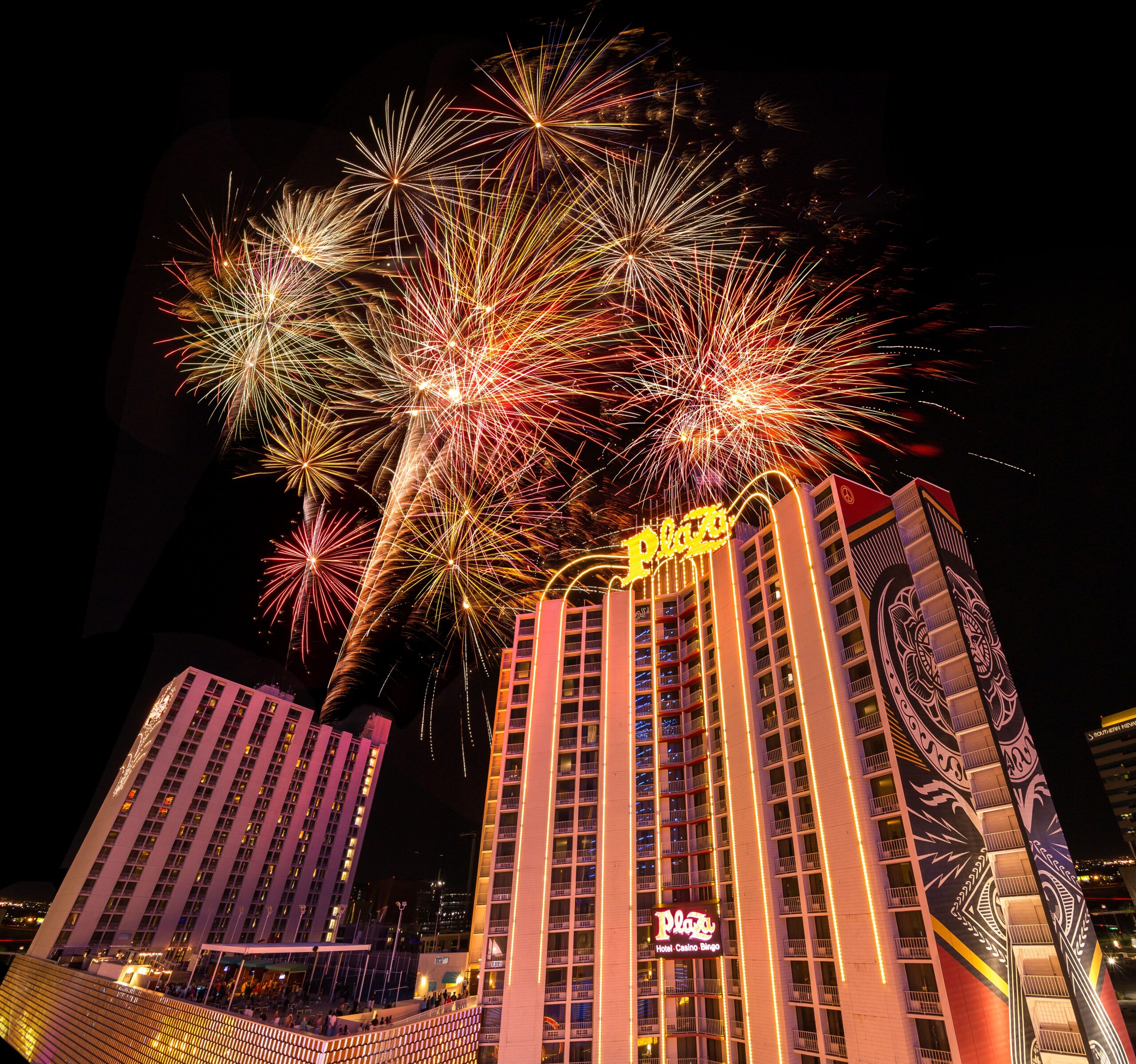 Staged from the top of the Plaza’s South Tower on Friday, July 4, at 9:15 pm, the public can watch the fireworks for free from in front of the Plaza on Main Street, which will be closed to vehicular traffic for viewing the fireworks from Carson Avenue to Ogden Avenue. Guests can also watch the fireworks from a free viewing party on the Plaza’s rooftop pool deck. Doors open for the rooftop viewing party at 7 pm.